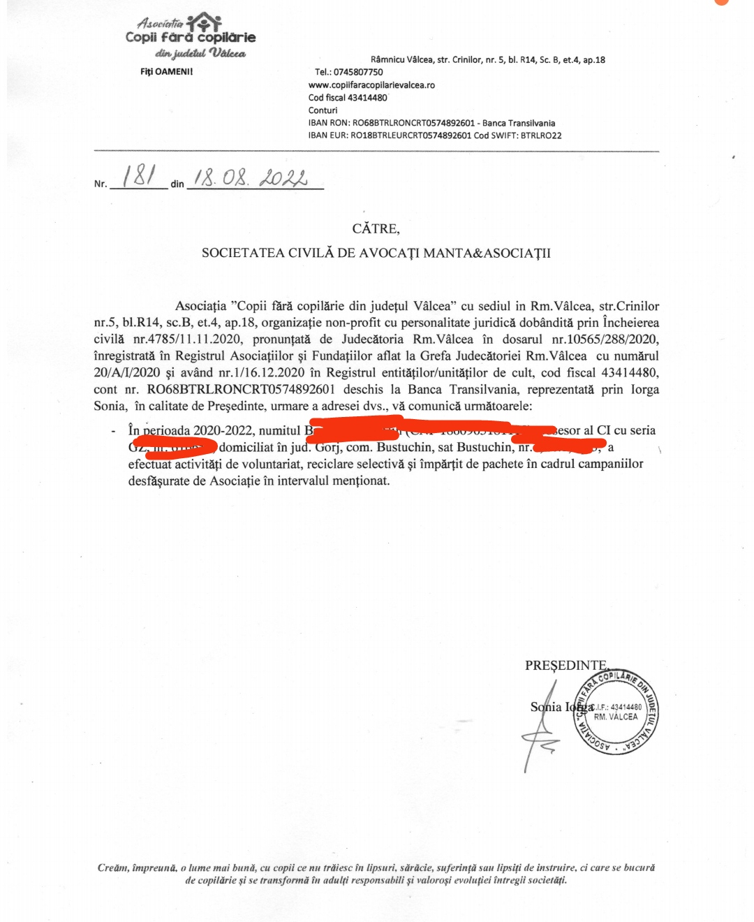 Trebuie menționat că familia polițistului a hotărât să ajute mama cu doi copii minori după ce soțul și soția au trecut prin clipe extrem de grele pentru a avea un copil. Mai exact, familia polițistului s-a întregit cu un bebeluș după 7 ani eșuate de încercări, cu o tentativă de a înfiat un copil și cu multă durere după sarcini repetate pierdute. Spunem asta pentru a înțelege că familia cu un copil de 4 ani, în prezent consiliat psihologic, a considerat că astfel, prin aceste gesturi de caritate, mulțumește Divinității pentru cadoul nesperat. Adică pentru un copil la vârsta de 36 de ani. Familia polițistului a ajutat constant cu donații și un ONG din Vâlcea, cum se vede in documentul de mai jos.