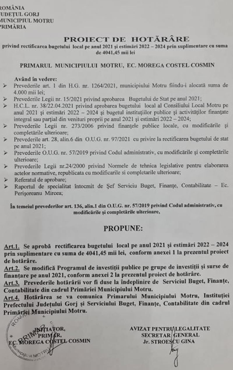 În urma solicitării Primăriei Motru, cele patru milioane de lei cerute Guvernului, au fost repartizate UAT-ului, edilul convocând ședință ,,de îndată” pentru rectificare de buget.