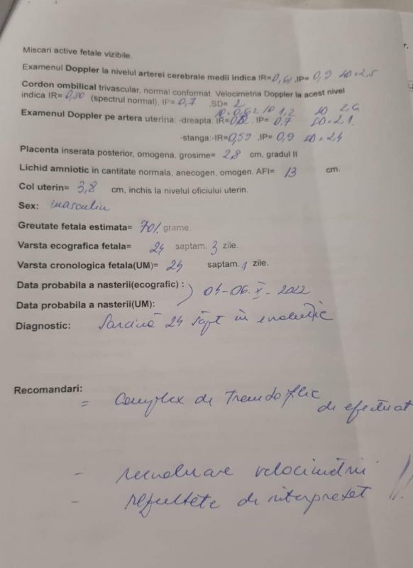 Vineri familia din Rovinari a revenit la cabinetul privat al Dr.Vasile, la Craiova, cu analiza facută. Pacienta a fost întrebată dacă vrea să i se explice analiza ori vrea și control. Gravida a cerut și control iar, soțul a fost scos afară din cabinetul doctoriței.