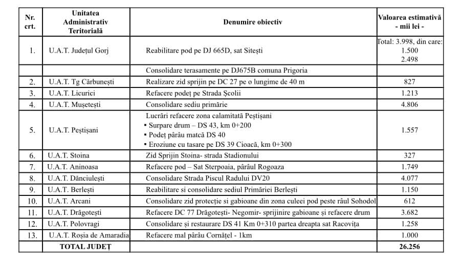 „Prefectul Cristina Cilibiu a fost astăzi (sâmbătă – n.red.) în teren, la solicitarea oamenilor din mai multe localități afectate de calamități. Ca urmare a discuțiilor purtate la fața locului, dar și a documentației întocmite de fiecare primărie, prefectul a înaintat Guvernului proiectul de hotărâre privind obținerea sumei necesare reparațiilor unor obiective importante din 12 localități: Județul Gorj, Oraș Tg. Cărbunești, comunele Aninoasa, Arcani, Berlești, Dănciulești, Drăgotești, Licurici, Mușetești, Peștișani, Polovragi, Stoina și Roșia de Amaradia. Conform estimărilor autorităților locale, certificate de comisia de constatare și evaluare a pagubelor, lucrările necesare pentru refacerea obiectivelor afectate se ridică la valoarea de aproximativ 26.256 mii lei, conform anexei la prezentul proiect de hotărâre”, a anunțat Prefectura Gorj.