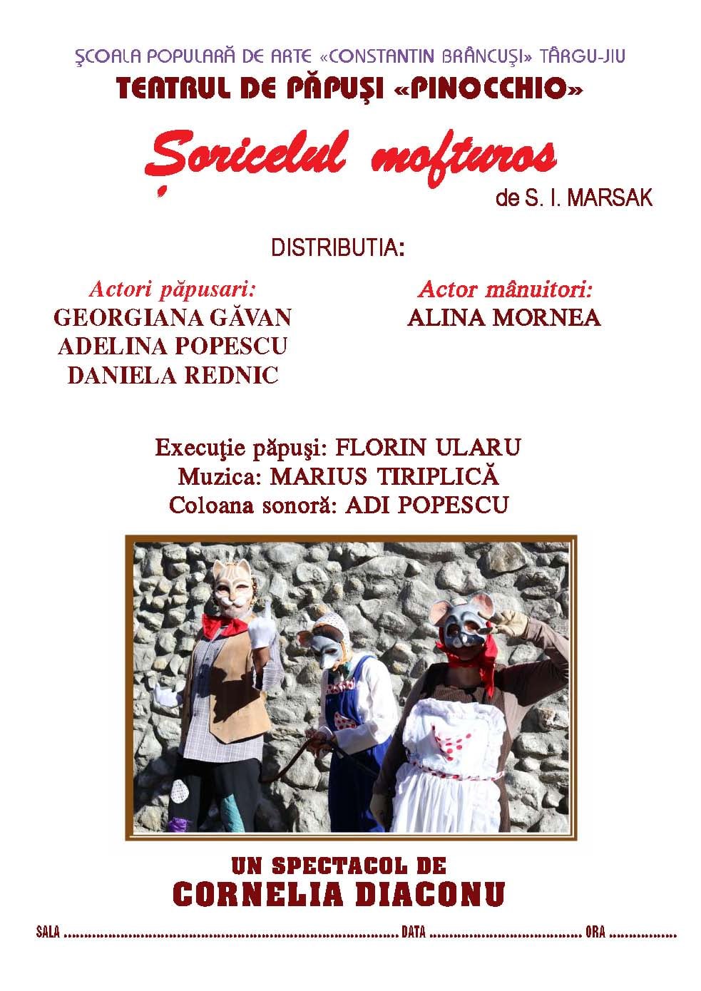 Marți, 24 august, începând cu ora 11:00, copiii de toate vârstele sunt invitați la Teatrul de Vară ”Nelu Dumitru” din Târgu-Jiu, la spectacolul ”Șoricelul mofturos”. Regia îi aparține actriței Cornelia Diaconu, iar personajelor le vor da viață actorii păpușari: Daniela Rednic, Adelina Popescu, Alina Mornea, Georgiana Găvan. Preț unui bilet este 7 lei. ”Biletele se pot achiziționa de la sediul Școlii Populare de Arte ”Constantin Brâncuși” Târgu Jiu (între orele 10:00-13:00). De asemenea, se pot procura și înainte de începerea reprezentației. Spectatorul, prin achiziționarea biletului de intrare la spectacol, acceptă condițiile de desfășurare a acestuia, respectiv: măsurarea temperaturii, portul măștii, precum și respectarea distanțării sociale. Vă așteptăm cu drag!”, au anunțat organizatorii.