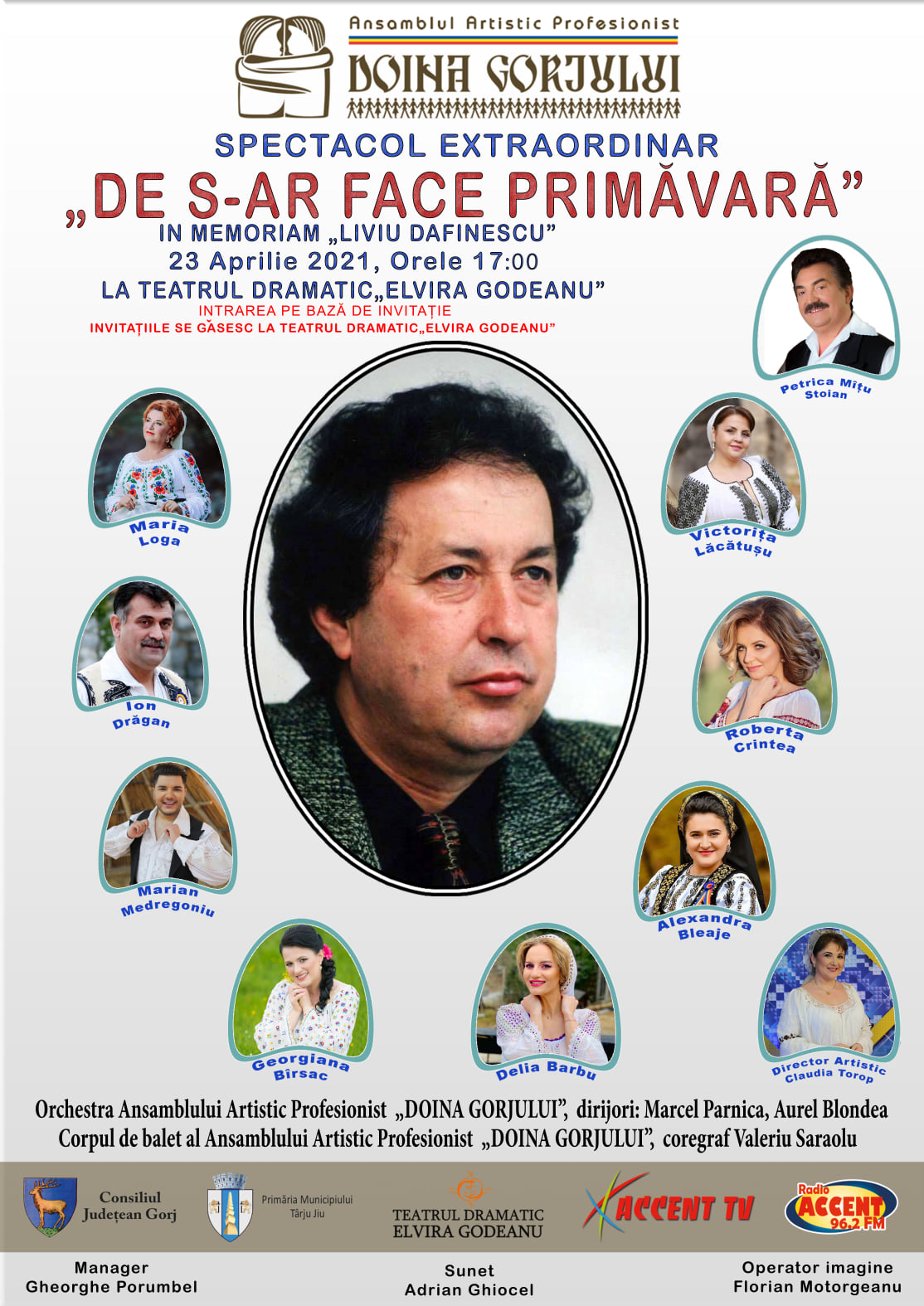 În data de 23 aprilie 2021, de la ora 17:00, Ansamblul Artistic Profesionist Doina Gorjului, va transmite live pe Facebook, spectacolul ”De s-ar face primăvară”, In Memoriam Liviu Dafinescu.