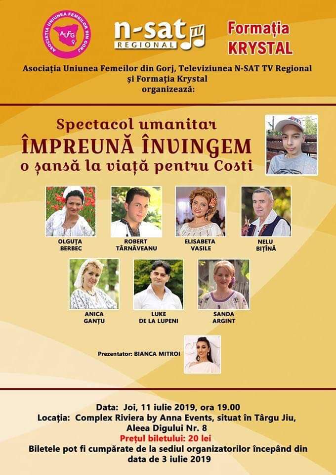 Asociația Uniunea Femeilor din Gorj, Televiziunea N-Sat Tv Regional și Formația Krystal organizează spectacolul umanitar “ÎMPREUNĂ ÎNVINGEM – o șansă la viață pentru Costi”. Evenimentul se va desfășura joi, 11 iulie 2019, începând cu ora 19:00, la Complexul Riviera by Anna Events din Târgu Jiu.