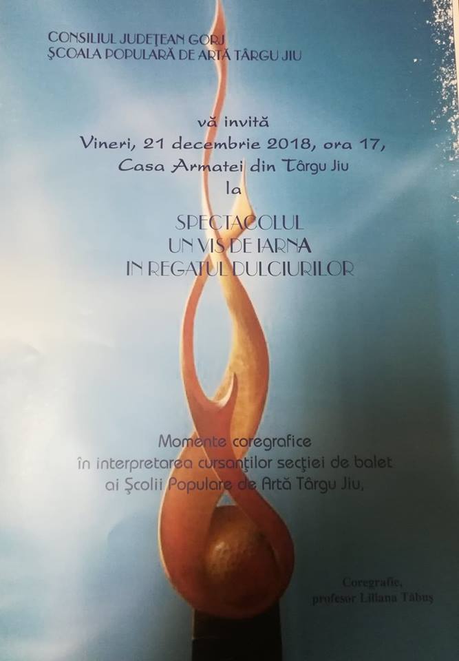 Astăzi, 21 decembrie, ora 17.00, la Casa Armatei, clasa de balet, din cadrul Școlii Populare de Artă Târgu-Jiu, coordonată de doamna Liliana Țăbuș va susține un spectacol coregrafic “Un vis de iarnă în Regatul dulciurilor”. ”Prin aceste mici spectacole pe care le organizăm, se urmărește familiarizarea cursanților cu scena, dezvoltarea atitudinii scenice, stăpânirea emoțiilor. Vă invităm să vă bucuraţi de balet, să le admiraţi, să le aplaudaţi pe micile balerine la scenă deschisă şi să le susţineţi în număr cât mai mare!”, au declarat reprezentanții Școlii Populare de Artă Târgu-Jiu.