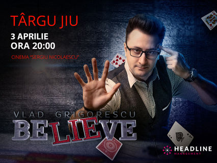 Acesta are programat un spectacol în oraşul lui Brâncuşi pentru data de 3 aprilie, de la ora 20.00, la Cinema „Sergiu Nicolaescu”. Biletele pot fi obţinute de pe site-urile specializate în vânzarea tichetelor, precum şi din magazine sau de la casa de bilete a Cinema „Sergiu Nicolaescu”, preţurile pentru showul oferit de Vlad Grigorescu la Târgu-Jiu fiind de 35, respectiv 45 de lei. „După succesul extraordinar al turneului anterior, Vlad Grigorescu revine cu un show 100% nou! BELIEVE este un show interactiv plin de lucruri imposibile şi întorsături care te vor lăsa cu gura căscată. Un show original şi amuzant în care, ca de obicei, publicul devine parte din spectacol, de pe scaun sau chiar pe scenă. Vino să trăieşti o experienţă LIVE unică! Nu vei vedea un spectacol. TU vei fi spectacolul. Pentru acest spectacol bilete se găsesc și în orașul tău! Tu alegi de unde cumperi. Ia biletul și vino la spectacol! Biletele se găsesc la Cinema ”Sergiu Nicolaescu” din Târgu-Jiu, dar și la magazinele Flanco sau IQBox Telekom. Rețeaua iabilet îți pune la dispoziție mai multe puncte de vânzare. Vezi aici lista completă pentru orașul tău: www.iabilet.ro/puncte-de-vanzare. Biletele pot fi prezentate atât în format fizic (print), cât și în format digital (pe telefon). Pentru alte întrebări sau probleme referitoare la biletele achiziționate, contactează-ne pe pagina de facebook Headline Management sau pe adresa de mail contact@iabilet.ro. Te informăm că la evenimentele noastre accesul persoanelor sub 12 ani nu este permis. Pentru acest eveniment nu este permisă renunțarea la biletele achiziționate. În caz de anulare a evenimentului, veți fi notificat pe email, iar contravaloarea biletelor este returnată în maxim șapte zile lucrătoare”, se arată pe site-ul de promovare al evenimentului ce va fi susţinut la Târgu-Jiu de Vlad Grigorescu.