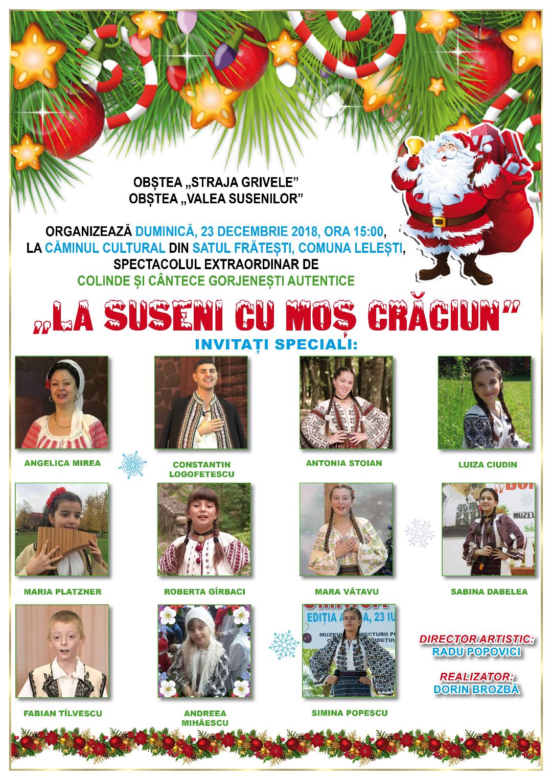 Căminul Cultural din satul Frătești găzduieşte, duminică, un eveniment devenit deja tradiție: spectacolul extraordinar de colinde şi cântece gorjeneşti autentice „La Suseni cu Moş Crăciun”. Realizator al spectacolului este omul de cultură Dorin Brozbă, iar director artistic este Radu Popovici.