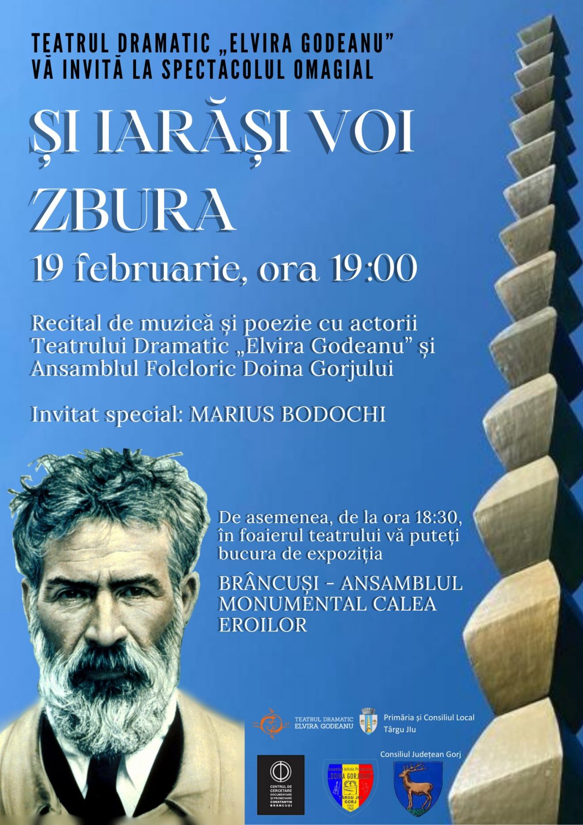 Teatrul Dramatic „Elvira Godeanu” din Târgu Jiu organizează luni, 19 februarie, spectacolul omagial „Și iarăși voi zbura”, dedicat lui Constantin Brâncuși.