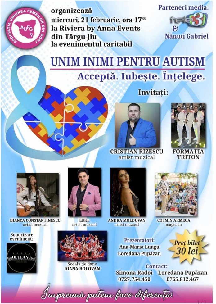 Pentru ajutorarea copiilor cu autism din Gorj, și implicit a familiilor acestora, Asociația Uniunea Femeilor din Gorj va organiza un spectacol umanitar miercuri, 21 februarie 2024, începând cu ora 17.00, la Riviera by ANNA EVENTS din Târgu Jiu. Vor participa în spectacol: Cristian Rizescu, formația gorjeană „Triton”, magicianul Cosmin Armega, Școala de dans Ioana Bolovan și artiștii muzicali: Bianca Constantinescu, Andra Moldovan și LUKE. Vor fi și alte surprize. Prezentatorii evenimentului vor fi Ana Maria Lungu și Loredana Pupăzan.