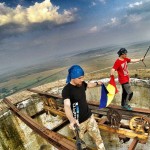 Marius, tânărul de 23 de ani, din Cluj, care a făcut furori pe internet, după ce s-a urcat pe un turn înalt de peste 250 de metri, s-a întors în weekend la Târgu-Jiu. De această dată, bărbatul care străbate țara în lung și în lat cu tirul nu a urcat singur pe clădire, ci alături de Flaviu Cernescu, un timișorean pasionat de sporturi extreme. Cei doi au fluturat drapelul României , iar Marius s-a filmat în timp ce stătea agăţat într-o mână la peste 250 de metri înălţime, fără nicio măsură de securitate. Imaginile surprinse de cameră sunt de-a dreptul incredibile. La un moment dat se observă cum un lemn cade în gol, însă clujeanul nu și-a pierdut concentrarea. Ca și nu ar fi fost de ajuns, ”Spiderman de România” a mers și mai departe cu demonstrațiile spectaculoase.