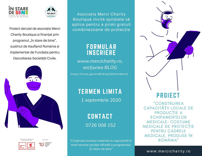 Spitalele din județul Gorj se pot înscrie până la 1 septembrie 2020 pentru a beneficia de combinezoane de protecție în mod gratuit prin proiectul ,,Construirea capacității locale de producție a echipamentelor medicale: costume medicale de protecție pentru cadrele medicale, produse în România”. Echipa afacerii sociale ,,Atelier Merci” a format un cluster din care fac parte patru ateliere din București pentru a produce local până la 4.000 de combinezoane de protecție pentru spitale spre a fi distribuite în mod gratuit până la jumătatea lunii noiembrie, dar și pentru a sprijini financiar atelierele partenere după cele câteva luni în stare de urgență în care volumul comenzilor s-a diminuat substanțial. Echipa va asigura și transportul coletelor cu combinezoane către spitale. Spitalele se pot înregistra pentru a beneficia de aceste combinezoane completând formularul disponibil online: https://forms.gle/4VMF6XqC85nhmMUc9. Termenul limită pentru înscriere este 1 septembrie 2020, ora 18.00. Echipa proiectului va analiza în perioada 1 – 10 septembrie 2020 solicitările primite și va răspunde individual pe email fiecărei solicitări. Recent, echipa a derulat și un training online de pregătire pentru asamblarea combinezoanelor pentru atelierele care fac parte din clusterul proiectului și a început producția combinezoanelor. Întregul proiect este derulat de asociația Merci Charity Boutique și finanțat prin programul „În stare de bine”, susținut de Kaufland România și implementat de Fundația pentru Dezvoltarea Societății Civile.