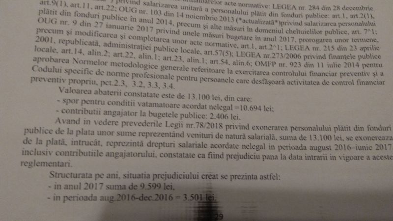 În urma verificării drepturilor salariale acordate personalului primăriei se constată că în perioada ianuarie-iunie 2017, primarul și viceprimarul au încasat spor de condiții vătămătoare în proces de 15%, ce a fost aplicat la indemnizația prevăzută de lege.