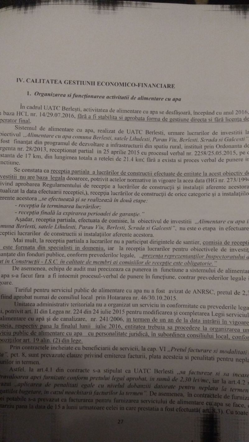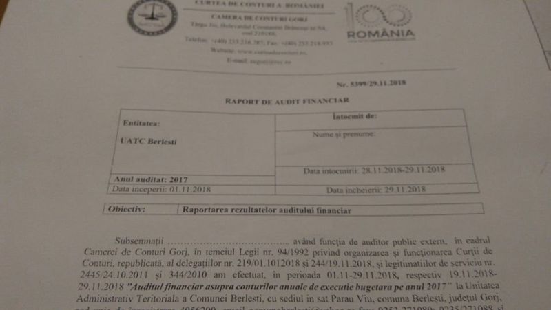 În raportul Curții de Conturi, realizat cu un an în urmă, la Primăria Berlești s-au constatat abateri de peste 445.000 de lei numai la elaborarea proiectului de buget propriu, fiind majorate incorect cu această sumă veniturile proprii în bugetul pe 2017.