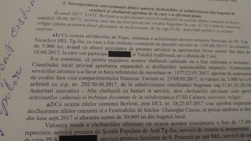 O eroare s-a comis și pentru organizarea zilelor comunei când s-au luat 30.000 de lei de la alte cheltuieli cu bunuri și servicii și nu de la cultură. La fel s-a procedat și în cazul achiziționării unor costume populare, cheltuindu-se 14.000 de lei.