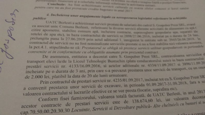 În raport se menționează că primăria a achiziționat servicii prestate de salariații firmei CL fără să fie nominalizate timpul de servicii prestate ori valoarea lucrărilor. La fel s-a procedat și pentru decontarea către această societate a transportului elevilor de la Liceul Tehnologic Bustuchin și pentru realizarea unor servicii de excavare.