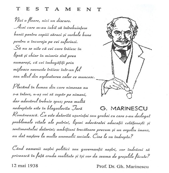 Acest testament magistral reprezintă piatra de temelie a caracterului semnatarului: modestia, sinceritatea, simplitatea, bunătatea, onestitatea, demnitatea, altruismul, exemplul, lupta pentru dreptate şi adevăr. Prin puterea caracterului a izbutit să ajungă fondatorul şcolii româneşti de neurologie. O splendidă lecţie de dirigenţie.