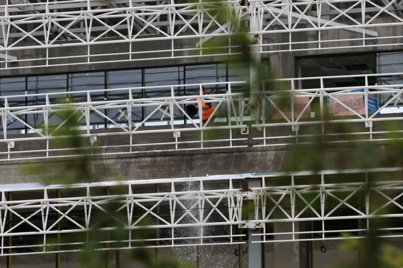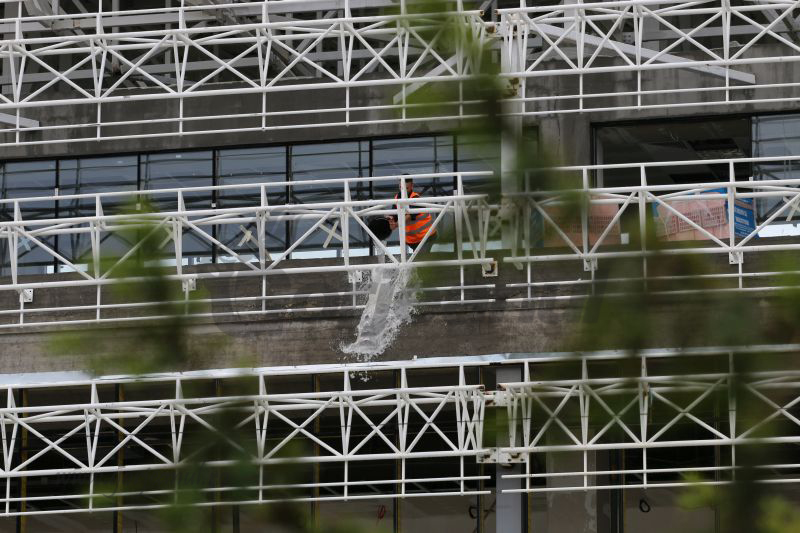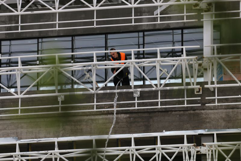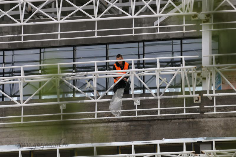 Stadionul Municipal din buricul orașului Târgu-Jiu a fost inundat serios după ploile torențiale de duminică seara și luni dimineața. O zi de muncă a fost astfel sacrificată de salariații firmelor prestatoare, muncitorii echipați cu căști de protecție, nu cu cizme de cauciuc, fiind nevoiți să scoată cu gălețile apa care a inundat încăperile, multe acoperite deja cu ferestre. Salariații spun că pe alocuri apa, adunată în urma ploilor, a depășit 30 de cm.