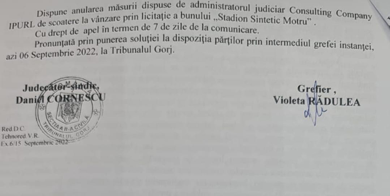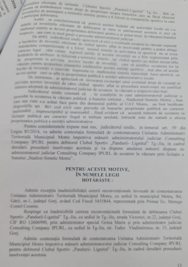 Din fericire, instanța de fond a dat câștig de cauză Primăriei Municipiului Motru. Asta și pentru că UAT-ul a reușit să prezinte documente și mai multe date cu privire la contractul încheiat între Pandurii și CSM Minerul Motru-Primăria Motru instanței de judecată, scoțând în evidență inclusiv că acest club nu a respectat contractul prin care se angajau să realizeze pe stadion investiții de peste 10 miliarde de lei vechi, ce trebuiau să îmbunătățească terenul sintetic, vestiarele, băile aferente dar si o tribună cu peste o sută de locuri, lucruri care nu s-au întâmplat.