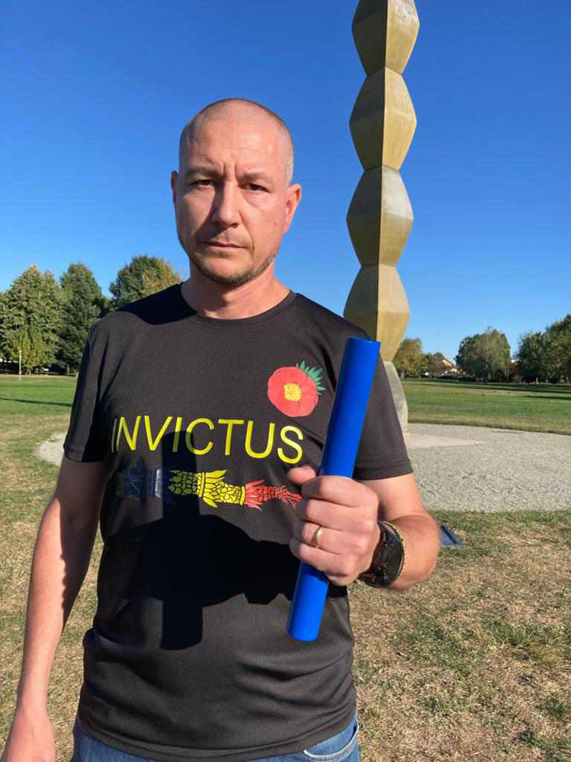 La Coloana Infinitului echipa de la Craiova a predat ștafeta albastră echipei de la Gorj, ștafeta fiind preluată de Dan Zidaru, un piteștean venit special la Târgu Jiu pentru acest eveniment, asociația Invictus neavând reprezentanți în plan local. „Aceasta nu este o competiție, nu e un concurs, nimeni nu primește medalii, e un eveniment la care participăm voluntar, atât militari, cât și civili. Suntem bucuroși că din ce în ce mai mulți voluntari, ca și mine, ne alăturăm acestei asociații, vrem să încurajăm mișcarea, la nivel național, dar și veteranii de azi, răniți în teatrele de operații. Aici au fost foarte mulți voluntari care au venit la Coloană, dar, în general, sunt din ce în ce mai mulți și în celelalte orașe puse pe harta ștafetei. Important este să se rețină că aceasta nu este o competiție, ci un omagiu pe care noi toți trebuie să îl aducem eroilor de ieri și de azi pentru sacrificiul făcut”, a menționat Dan Zidaru. Acesta a pornit ieri dimineață cu ștafeta albastră spre Petroșani pentru a o preda altor voluntari, traseul acesteia incluzând în zilele următoare Deva, Timișoara, Arad și alte localități din vestul țării. Pe 25 octombrie, de Ziua Armatei, toate cele trei ștafete aflate acum prin țară se vor reuni la Carei pentru a forma, în mod simbolic, tricolorul.