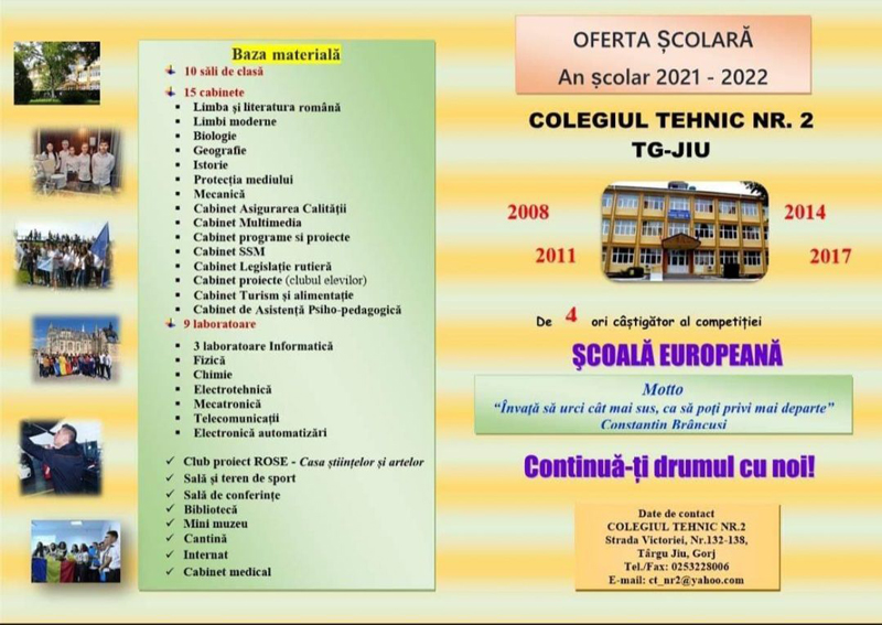 Proiectele internaționale Erasmus+, precum și cele Comenius, Twinning, Grundig, sunt cele care au adus Colegiului Tehnic Nr.2 titlul de ȘCOALĂ EUROPEANĂ de 4 ori, iar acest lucru se traduce prin implicare, rezultate, calitate, performanță în domeniu, implicând și titulatura de școală care practică un învățământ incluziv. Pentru că suntem interesați de reușită, implementăm la ora actuala și proiectul ROSE de pregătire remedială. Așadar, propunem un învățământ care să corespunda nevoilor elevilor, unul flexibil, în care fiecare se poate regăsi. Fii elev CT2, alege-ti viitorul alături de noi, prinde aripi cu noi și vei învăța ce înseamnă reușită! Alege ÎNȚELEPT Colegiul Tehnic Nr.2! Alege șansa de a fi tu însuți într-o colegiu care se adaptează nevoilor elevilor și învățării acestora. Îți urăm de pe acum…Bine ai venit alături de noi la CT2! Pagina de Facebook a colegiului este o carte de vizită.