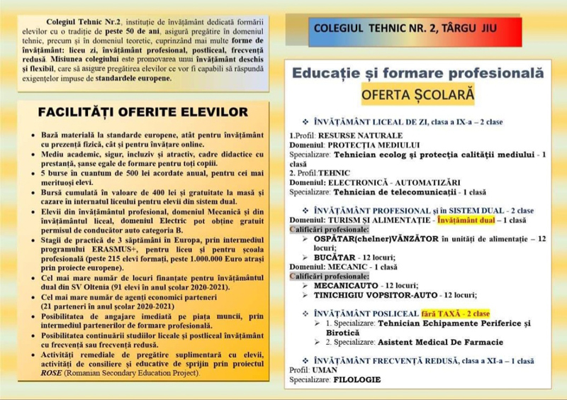 Atât clasele de liceu, cât și cele de profesională sunt parte a proiectelor Erasmus +, care la Colegiul Tehnic Nr.2 sunt o tradiție, dovedind seriozitate, implicare, competență și performanță. Pentru anul școlar 2021- 2022, oferta noastră educațională este una diversă, pornind de la clase de liceu pe specializările Protecția Mediului și Electronică- Automatizări, de profesională și învățământ dual, cu specializări precum mecanic auto, tinichigiu, bucătar, chelner- ospătar, și postliceală, care facilitează un învățământ gratuit, specializări de farmacie și birotică.