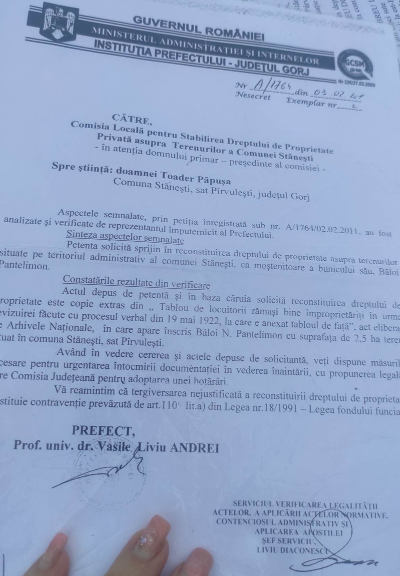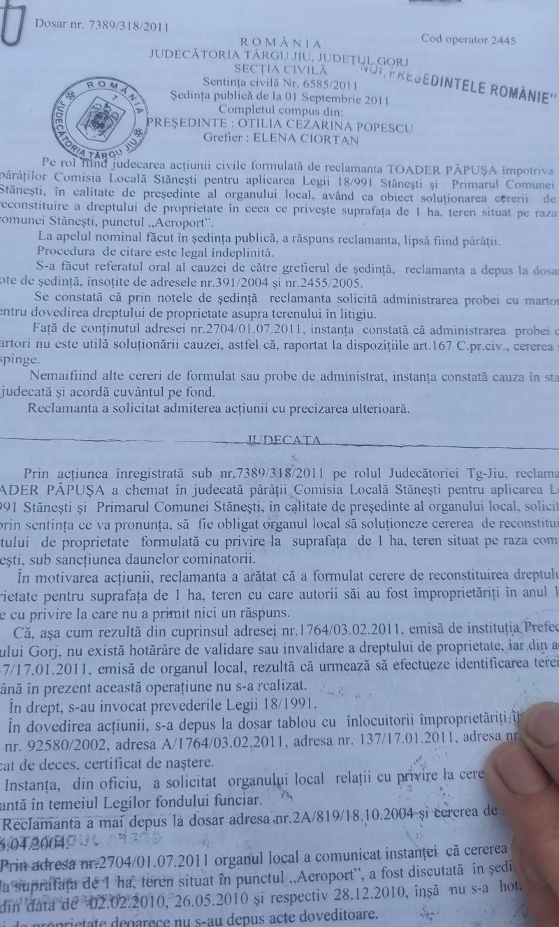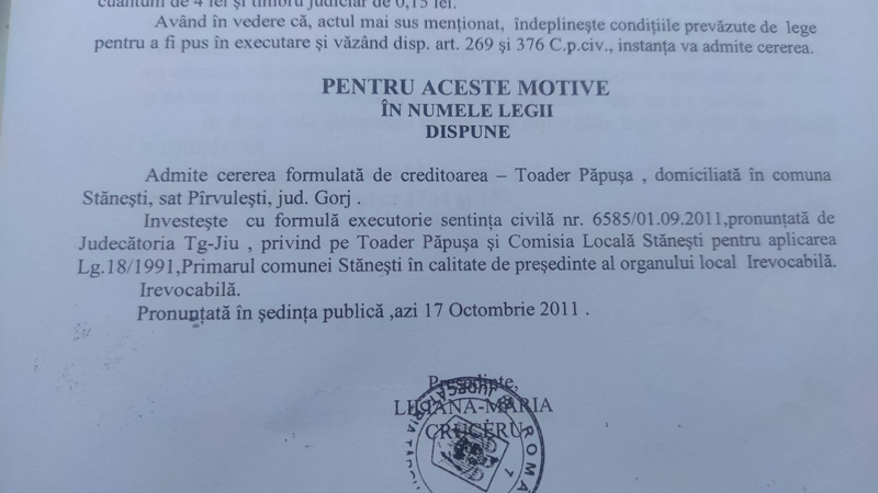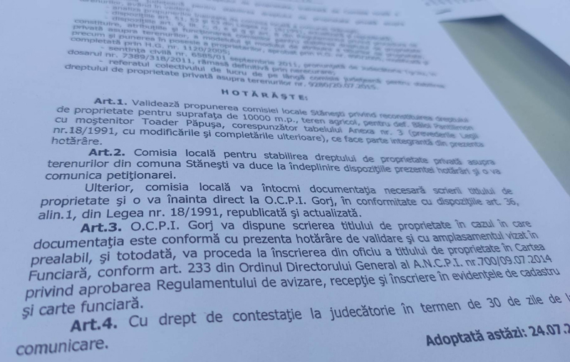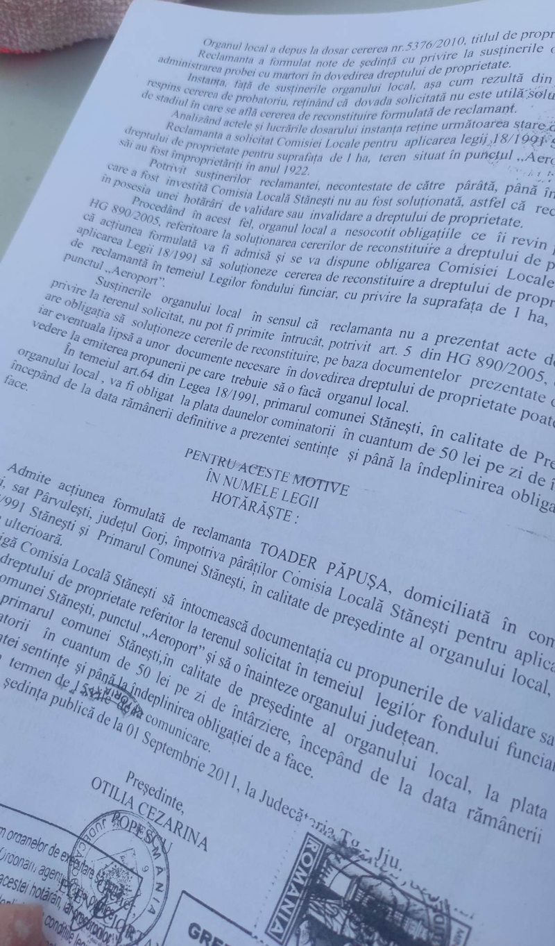 Soții Pușa și Dumitru Toader, în vârstă de 76 de ani fiecare, din comuna Stănești, sat Pârvulesti, așteaptă de zece ani să obțină de la autoritățile locale un titlu de proprietate pentru un hectar de teren situat în zona Aeroport-Tarlale. Terenul a fost moștenit de cei doi de la bunicul femeii, fost veteran de război. Practic, Pușa Toader a moștenit terenul în 2013 dar fără titlu de proprietate. A început imediat demersurile la primăria din Stănești pentru a obține titlul de proprietate. Autoritatea locală, aflată sub conducerea lui Vasile Pârvulescu, primar cu mai multe mandate, în loc să ajute femeia să obțină actul respectiv, practic, a împiedicat-o să îl capete. Printr-o lipsă de profesionalism și multă nepăsare, responsabilii primăriei nu au făcut diligențele necesare la OCPI Gorj. Iar în decembrie 2013 i-au determinat pe cei doi soți să accepte un alt teren din zonă, pe motiv că proprietatea pe care o aveau în acte nu poate fi transmisă proprietarilor de drept. Oamenii au acceptat, mergând pe buna credință a UAT-ului, negândindu-se vreun moment că vor mai trece încă aproape zece ani și ei tot nu vor avea titlul de proprietate dorit.