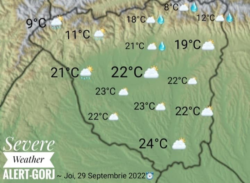 Cerul se va menține predominant noros, ce este drept, în cea mai mare parte a județului nostru, temporar fiind așteptate și averse slabe, cel mult moderate de ploaie, în zonele din vestul și nord vestul teritoriului gorjenesc {mai ales în zona montană}, însă temporar își va face simțită prezența și soarele.