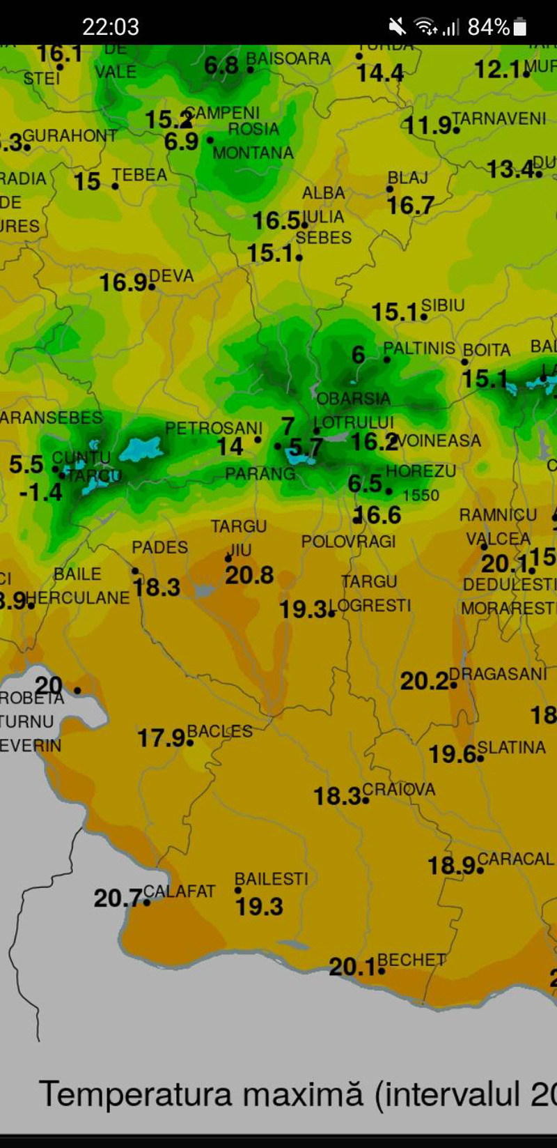 De altfel, la stația meteorologică ANM- Târgu-Jiu am atins și maxima națională (oficială) a acestei zile, cu 21°C, în paralel cu cea mai ridicată minimă termică din România, la stația Apa Neagră – Padeș, de 12°C, la orele dimineții de 21 Februarie, datorită factorilor locali, care au influențat procesul de răcire radiativă!