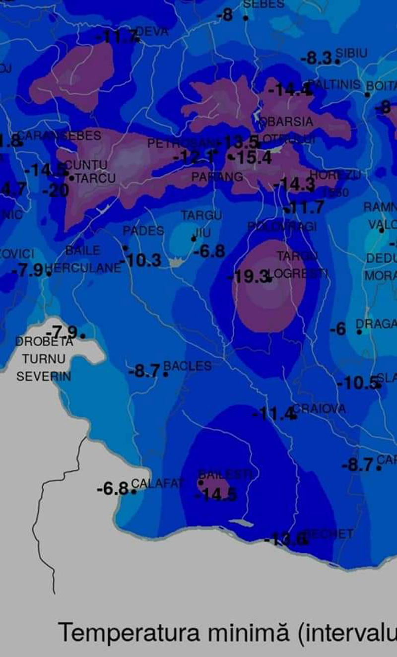 -10,3°C {Padeș}, cea mai ridicată temperatură atingându-se în Municipiul Târgu-Jiu (-6,8°C), unde aerul mai cald din zona urbană s-a ridicat mai lent din pricina factorilor locali.