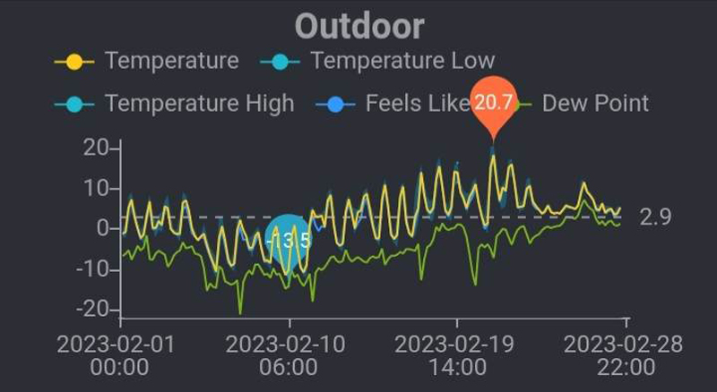 Temperatura maximă lunară: 20,7°C {record termic al stației; cea mai caldă zi a iernii calendaristice 2022 -2023}