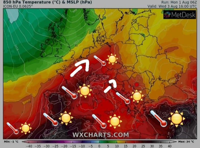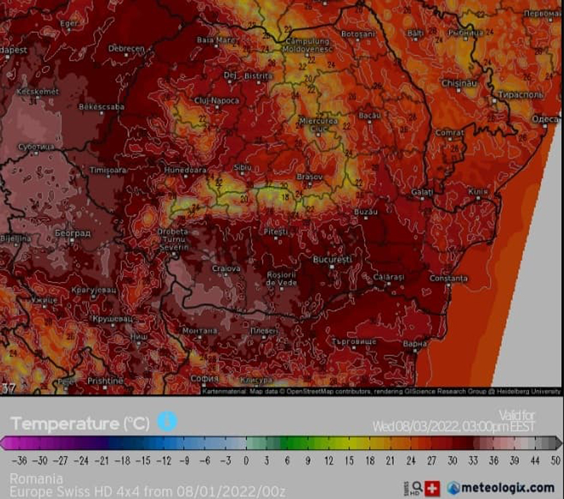 Miercuri, atmosfera va fi similară, iar valorile termice vor continua ușor să mai adauge câteva grade, acestea regăsindu-se între: 20°C {la munte, la general vorbind}…34°C, posibil 35°C, {izolat – în sudul județului}!