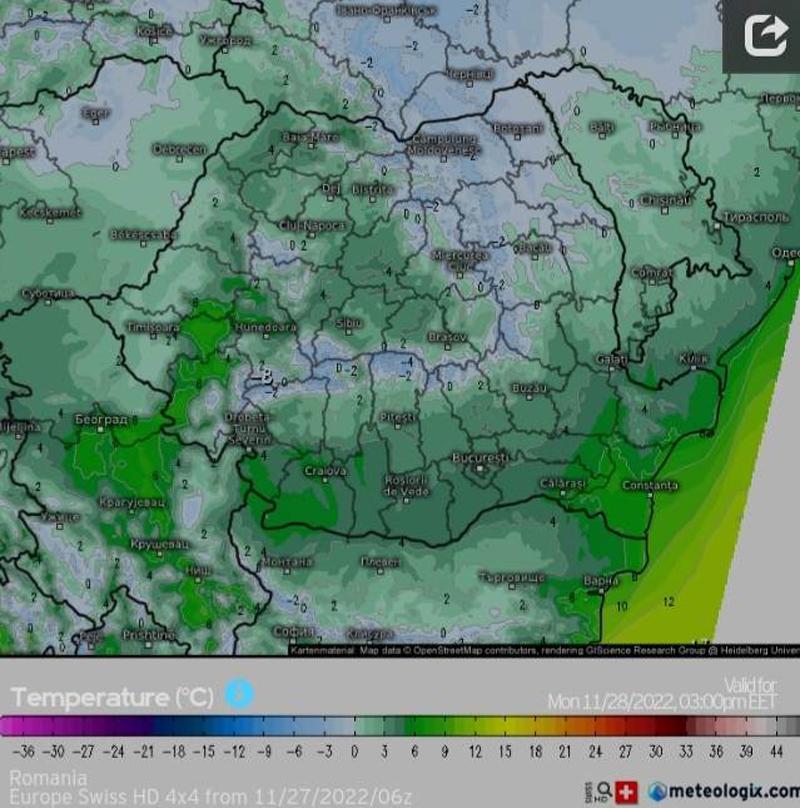 Astfel, ziua de azi {Luni, 28 Noiembrie 2022}, va menține o atmosferă închisă, similară cu cea de duminică, văzduhul păstrându-se noros.