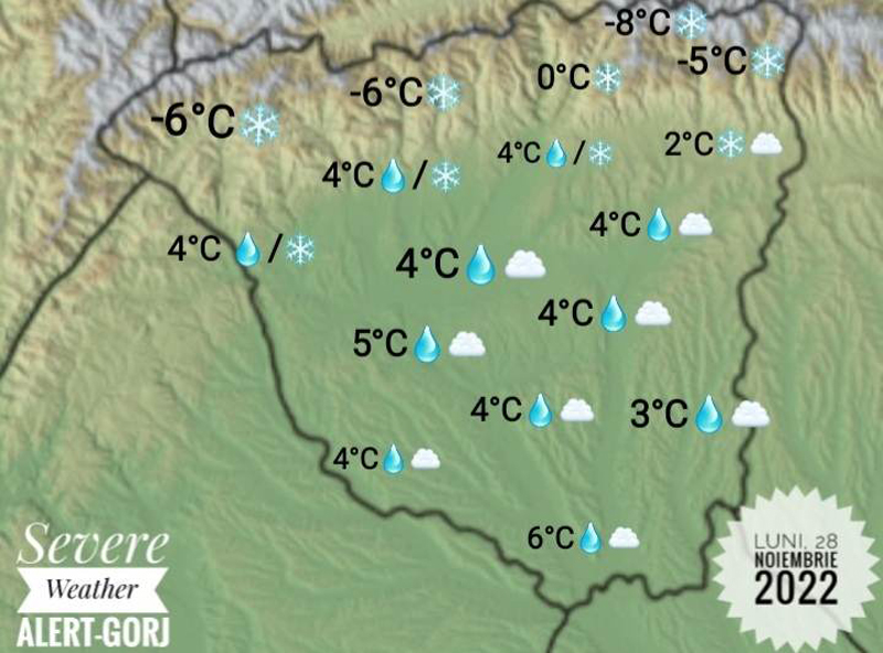 În întregimea lanțului muntos gorjenesc, valorilor vor fi negative, iar în restul județului, cu greu va fi depășit pragul de 5°C, discutând de temperaturi mai coborâte decât cele potrivite acestei perioade!