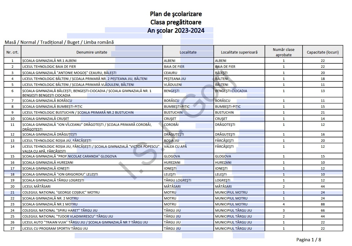 Miercuri începe prima etapă a înscrierilor la clasa pregătitoare pentru anul școlar 2023-2024. Pot fi înscrişi copiii care împlinesc vârsta de 6 ani până la 31 august 2023, inclusiv cei care împlinesc 6 ani în perioada 1 septembrie – 31 decembrie 2023, în baza evaluării Centrului Judeţean de Resurse şi Asistenţă Educaţională. În județ sunt 2.413 locuri la clasa pregătitoare în 130 de clase. Numai în Târgu-Jiu sunt peste 760 de locuri pentru elevi, cele mai multe la școlile „Constantin Săvoiu”, „Alexandru Ștefulescu”, „Sfântul Nicolae” și „Gheorghe Tătărescu”. Sunt și școli în județ unde, din cauza numărului foarte mic de elevi, se va învăța în sistem simultan.