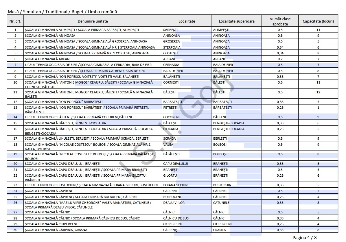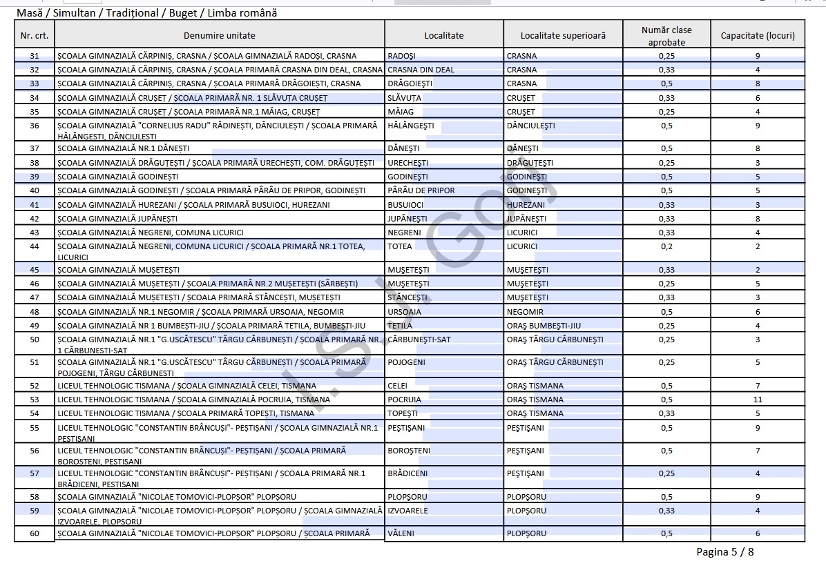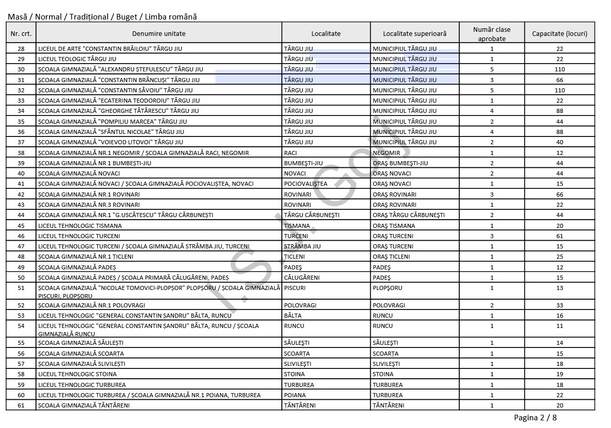 La Colegiul Național „Spiru Haret” și la Școala Gimnazială „Constantin Brâncuși” vor fi trei clase, cu o capacitate de 66 de locuri, iar alte două clase au fost înființate la Colegiul Național „Tudor Vladimirescu” și la școlile gimnaziale „Pompiliu Marcea” și „Voievod Litovoi”.