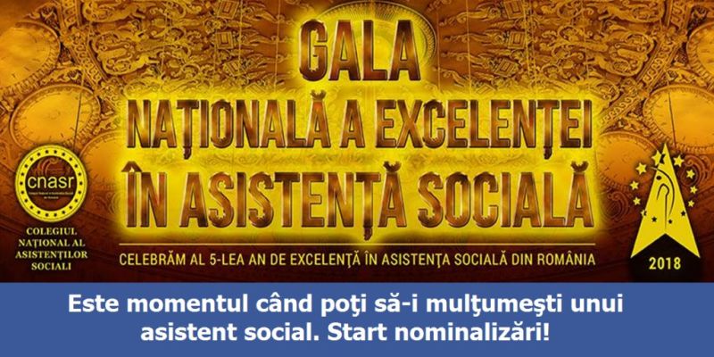 Colegiul Naţional al Asistenţilor Sociali din România (CNASR) organizează, în acest an, cea de-a V-a ediţie a Galei Naţionale a Excelenţei în Asistenţa Socială. Lista premiilor Galei Naţionale a Excelenţei în Asistenţă Socială, ediția a V-a 2018 este: Premiul asistentul social al anului; Premiul pentru asistentul social din domeniul protecţiei copilului; Asistentul social din domeniul persoanelor cu dizabilităţi; Asistentul social din domeniul sănătate / servicii medicale; Asistentul social din domeniul reintegrării sociale a persoanei private de libertate; Asistentul social din domeniul incluziunii persoanelor fără adăpost; Asistentul social din domeniul persoanelor vârstnice şi îngrijrii la domiciliu; Asistentul social din domeniul combaterii discriminării/ minorităţi; Asistentul social din domeniul incluziunii sociale / economie socială; Asistentul social din domeniul asistenţei sociale comunitare; Asistentul social din domeniul prevenirii / reducerii riscurilor asociate infecţiei cu HIV, consumului de droguri şi exploatării sexuale; Premiul pentru jurnalism; Premiul politicianul anului; Premiul instituţia anului; Premiul personalitatea anului în promovarea educaţiei şi formării în asistenţa socială; Premiul de excelenţă pentru promovarea profesiei liberale de asistent social; Premiul pentru întreaga carieră în promovarea asistenţei sociale; Premiul pentru cea mai activă sucursală a CNASR. În perioada 19 februarie (ora 10.00) – 26 februarie (ora 00.00) are loc votul on-line, iar între 27 februarie şi 12 martie se va face jurizarea.