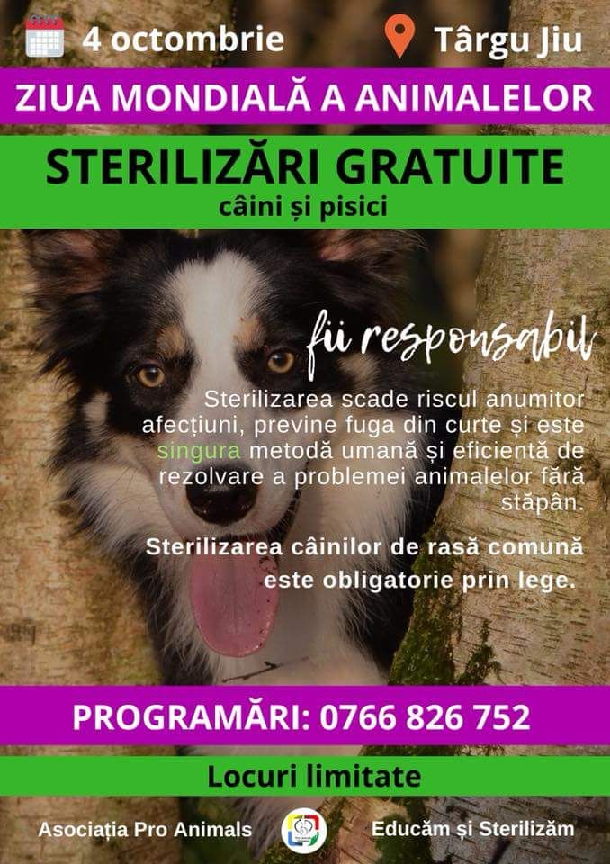 Asociația Pro Animals din Târgu-Jiu organizează în această săptămână o nouă acțiune de sterilizări, parte a programului „Educăm și sterilizăm”. „Cum altfel am putea sărbători Ziua Mondială a Animalelor decât printr-o campanie de sterilizări pentru stoparea înmulțirii necontrolate și pentru reducerea numărului animalelor din adăposturi, de pe străzi, care nu au nicio șansă la o familie? Vino pe 4 octombrie cu câinele/pisica la sterilizare! Fii responsabil! Arată că îți pasă – nu doar de animăluțul tău, dar și de situația generală a animalelor care nu au oportunitatea de a fi adoptate niciodată! Pe 4 octombrie, de ziua prietenilor noștri blănoși care ne iubesc necondiționat, vei putea să participi și la o tombolă, iar dacă vei câștiga, animăluțul tău va avea parte de un cadou din partea noastră! Vă rugăm să nu hrăniți animăluțele cu 12 ore înainte de intervenție, să aduceți o pătură, un prosop sau o cușcă și să le asigurați un loc pentru recuperarea post-operatorie pentru cel puțin 5 zile! Programări la numărul de telefon: 0766826752”, au anunțat reprezentanții Asociației Pro Animals Târgu-Jiu.
