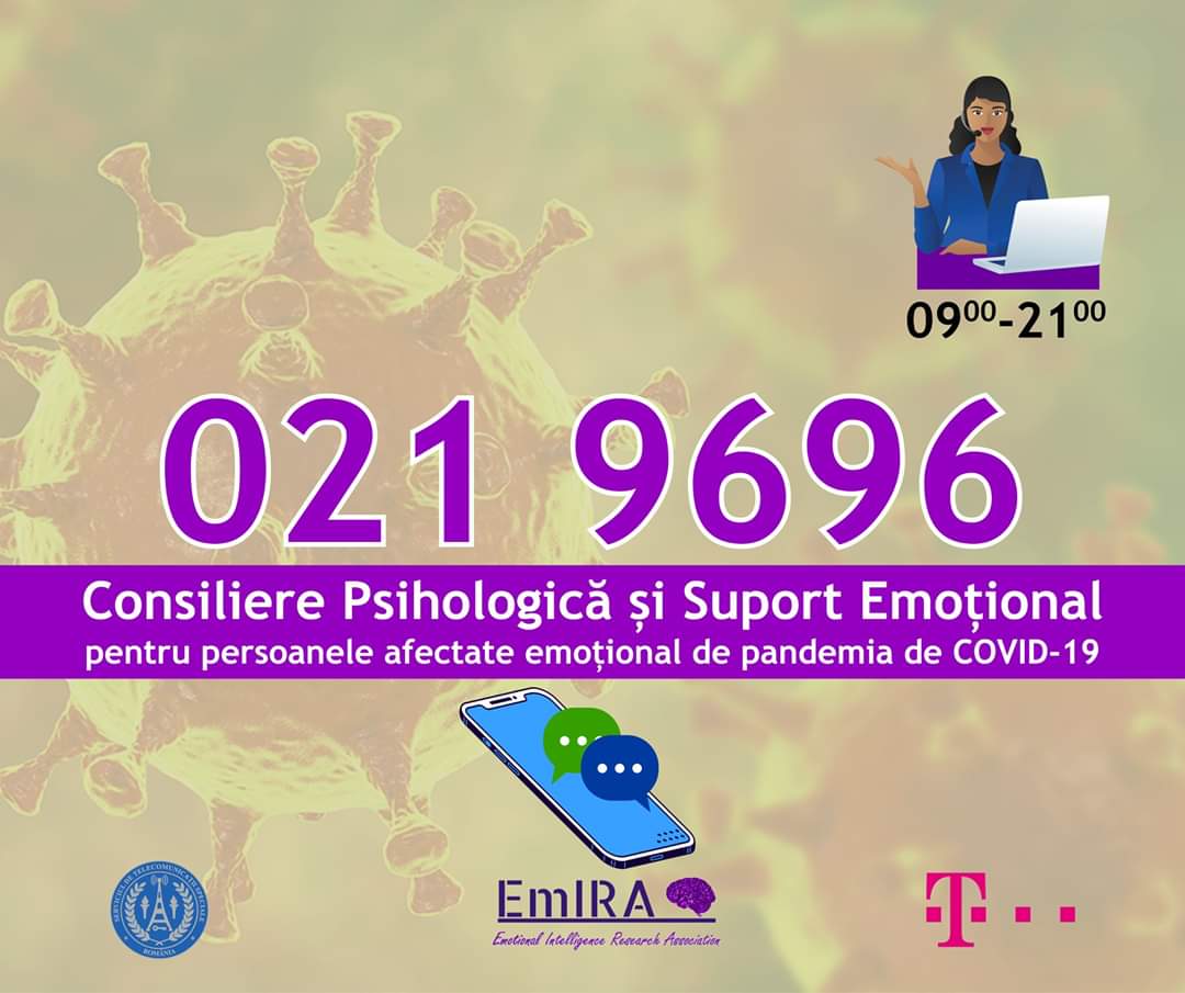 STS împreună cu EmIRA și Telekom România pun la dispoziție o Linie de Consiliere Psihologică și Suport Emoțional pentru persoanele spitalizate, aflate în carantină sau în izolare, pentru personalul medical supus stresului, precum și pentru persoanele puternic afectate de pandemia de COVID-19.