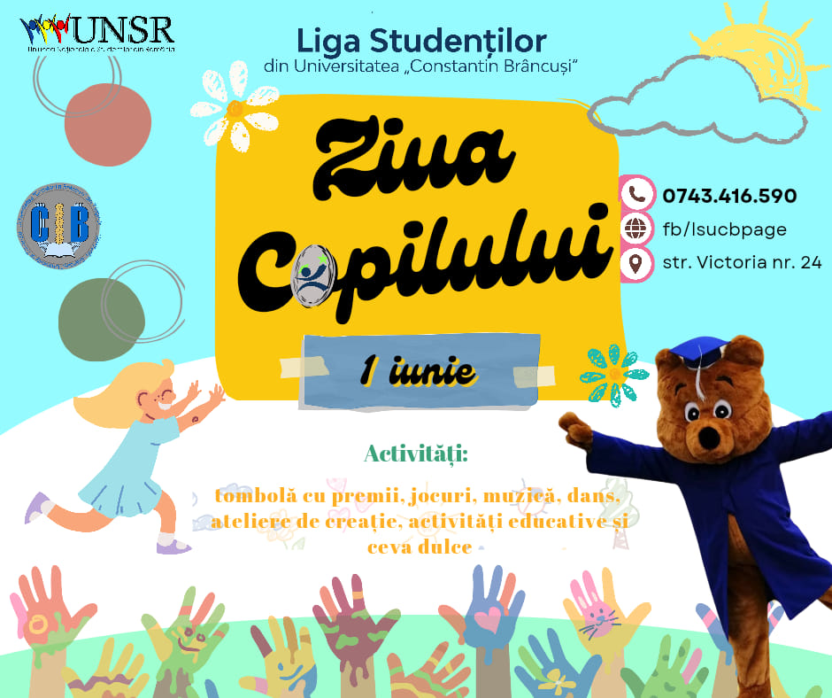 ”Dragi părinți și copii, pregătiți-vă pentru cel mai tare eveniment de 1 Iunie organizat de Liga Studenților din Universitatea „Constantin Brâncuși”! Când? 1 Iunie 2024. Unde? Facultatea de Stiințe ale Educației, Drept și Administrație Publică (str. Victoriei, nr. 24). Ora? Începând cu ora 12:00. Și ghici ce? Ursul Brumi, mascota noastră preferată, va fi acolo să distreze toți copiii! Avem pregătite o mulțime de surprize pentru voi: Muzică și Dans; Jocuri și Concursuri; Ateliere de Creație; Educație și Învățare; Delicii Dulci. Vino să sărbătorim împreună Ziua Internațională a Copilului și să ne bucurăm de o zi plină de zâmbete și voie bună! Nu uita să-ți aduci prietenii și familia!”, au anunțat prezentanții Ligii Studenților din cadrul UCB Târgu Jiu.