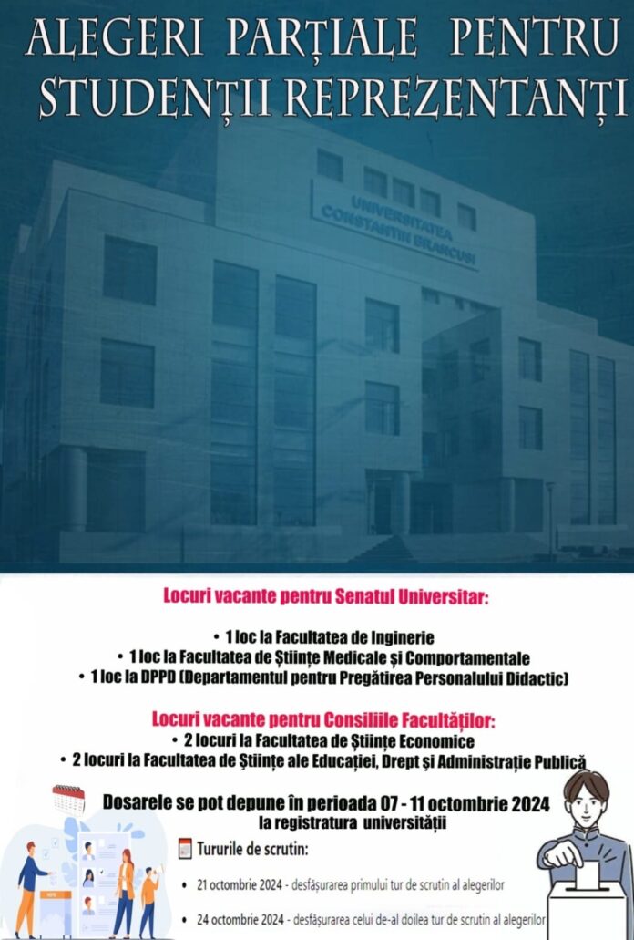 ”Vrei să-ţi reprezinți colegii în Senat sau în consiliile facultăților? Acum ai ocazia să fii vocea studenților şi să contribui la îmbunătățirea mediului academic. Locuri vacante: pentru Senat – 1 loc la Facultatea de Inginerie, 1 loc la Facultatea de Științe Medicale și Comportamentale, 1 loc la Departamentul pentru Pregătirea Personalului Didactic; pentru consiliile facultăților – două locuri la Facultatea de Științe Economice, două locuri la Facultatea de Științe ale Educaţiei, Drept şi Administraţie Publică. Dosarele se pot depune în perioada 07 – 11 octombrie 2024 la Registratura Universităţii. Alegerile vor avea loc la sediul UCB din strada Tineretului, nr. 4. Vor fi două tururi de scrutin, respectiv în zilele de 21 și 24 octombrie 2024. Condiții pentru a candida: Ești student la facultatea pentru care candidezi, la forma de învățământ cu frecvență; Ești integralist (ai promovat toate examenele în anul universitar trecut); Documente necesare pentru depunerea candidaturii – cerere tip (anexa 3 din regulament), scrisoare de intenție, adeverință de la secretariatul facultății care să confirme anul, grupa și programul de studiu, dar și faptul că ești integralist, copie xerox a C.I./B.I.”, au transmis reprezentanții UCB Târgu Jiu.
