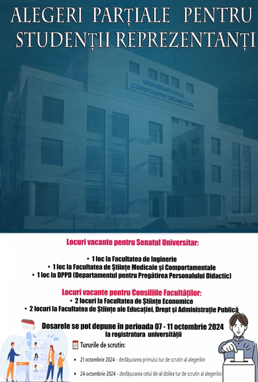 Până pe 11 octombrie 2024, Universitatea ”Constantin Brâncuși” Târgu Jiu primește dosarele studenților care vor să își reprezinte colegii în Senatul instituției de învățământ superior sau în consiliile facultăților.