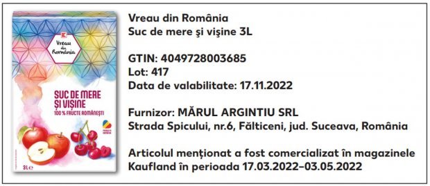 Această rechemare vizează exclusiv produsul „ Vreau din România Suc de mere şi vişine 3L”, lot: 417, data de valabilitate: 17.11.2022, conform declarației producătorului SC Mărul Argintiu SRL. Kaufland își cere scuze clienților pentru situația creată”, se arată pe site-ul ANSVSA.
