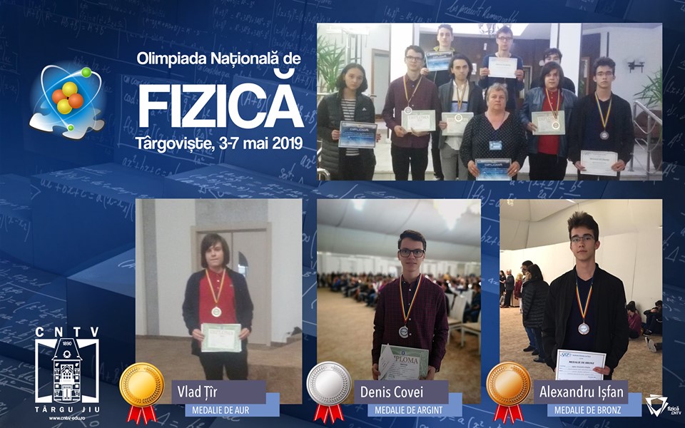Trei elevi ai Colegiului Naţional „Tudor Vladimirescu” Târgu Jiu au obținut distincții în urma participării la Olimpiada Națională de Fizică, ce a avut loc la Târgoviște în perioada 3-7 mai 2019. Este vorba despre: Țîr Vlad Ioan (11A), Premiul II MEN, Medalie de Aur, calificare în lotul lărgit al României, în vederea participării la Olimpiada Internațională de Fizică; Covei Denis (9B), Mențiune MEN, Medalie de Argint; Ișfan Ștefan Alexandru (8), Medalie de Bronz.