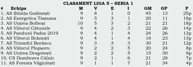 Jiul Rovinari stă în coasta liderului CSO Turceni. Liga a patra a programat etapa cu numărul 11 în weekend, iar rovinărenii au obținut o victorie prețioasă pe terenul de la Țînțăreni. Elevii lui Ion Lițoiu s-au impus cu 2-1. Horia Şitoianu și Ionuț Tătaru au înscris pentru vizitatori. Echipa lui Viorel Cojocaru a stat în această rundă, dar rămâne pe primul loc datorită golaverajului superior. Cel mai concludent succes al etapei a fost obținut de Vulturii Fărcășești. Liga 5 a fost mai bogată în goluri. Runda cu numărul 10 a adus meciuri spectaculoase în ambele serii. Cele mai multe reușite s-au consemnat la Brănești, Polovragi și Bengești.