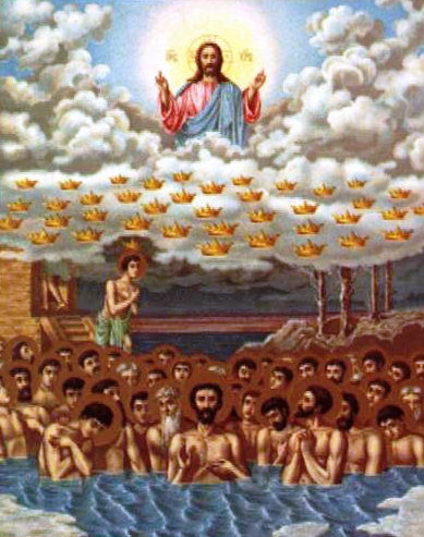 În faţa unui refuz categoric, Lisius porunceşte să fie lapidaţi, însă, slujitorii, î ncercând să-i lovească cu pietre pe cei 40, se lovesc unii pe alţii, însuşi Lisius, în încercarea de a-i lovi pe mucenici, s-a trezit cu o piatră exact în obrazul său. Văzând această minune, guvernatorul îi aruncă din nou pe cei 40 de ostaşi în temniţă, pentru a se gândi la pedeapsa pentru nesupuşi. În ziua următoare, cei 40 de viteji sunt duşi la un iezer de lângă cetate, cu apele îngheţate, iar spre seară, aceştia sunt dezbrăcaţi şi lăsaţi în apă, pe un ger şi un viscol de crăpau pietrele! Pe malul lacului, cei care îi păzeau, aduseseră o cadă mare cu apă caldă, care era menită să-i ispitească pe ostaşi, ca să iasă şi să se încălzească, aşa cum sunt ispitiţi corifeii pandemiei actuale cu bani grămadă! La o vreme, unul dintre cei 40 de martiri, nu mai poate răbda şi cedează, iese din lac şi încercă să ajungă la cada cu apă caldă, însă, se prăbuşeşte mort, fiind săvârşită astfel o nouă minune. După alte câteva ore, o lumină puternică şi caldă ca soarele, înmuia gerul şi topea gheaţa, iar din cer s-au pogorât deasupra capetelor sfinţilor treizeci şi nouă de cununi. Atunci, unul dintre străjerii care îi păzeau, pe numele său Aglaius (Aglaie), văzând minunea, a înţeles că acela care ieşise din apă fusese exclus din ceata sfinţilor, pentru ca într-un gest de solidaritate, chiar el să-şi arunce pe mal hainele şi să se alăture celorlalţi strigând: «Şi eu sunt creştin», după care, la ivirea zorilor, Lisius şi Agricola rămân uimiţi când îi găsesc pe cei 40 vii şi nevătămaţi. Ca urmare, demnitarii romani ordonă ca să fie scoşi martirii din apă şi să li se sfărâme gleznele cu ciocanul, iar, sfinţii, răbdând chinurile cumplite, îşi dau sufletul în mâinile Domnului, pentru ca în final, Agricola şi Lisius să ordone ca trupurile să le fie arse, iar apoi oasele să fie aruncate într-un râu, pentru a li se pierde urma. Însă, după alte trei zile, Sfinţii 40 de Mucenici se arătară în vis Episcopului cetăţii, pe numele său de Petru, şi îi cerură să vină în acea noapte să-i scoată din râu, iar, oasele lor să le pună la păstrare, cinstindu-le, aşa cum se cuvine unor martiri ai lui Dumnezeu, pentru că în decursul vremii, după aceea, moaştele lor au fost răspândite în biserici din întreaga lume. În Capitala României, părticele din moaştele Sfinţilor 40 de Mucenici din Sevastia se regăsesc la Schitul «Darvari», la Biserica «Sfântul Alexie» de pe Calea «Şerban Vodă», la Mănăstirea «Antim», la Biserica «Icoanei», acolo unde slujeşte şi conjudeţeanul nostru, Pr. Ioan Popescu, de la Crasna, la Biserica «Mihai Vodă» şi la Biserica «Dichiu» de pe Strada «Icoanei». Poate că merită să le amintim numele celor 40 de Mucenici, care sunt: Chirion, Candid, Domnos, Isihie, Ieraclie, Smaragd, Valent, Vivian, Evnichie, Claudie, Prisc, Teodul, Eutihie, Ioan, Xantie, Ilian, Sisinie, Aghie, Aetie, Flavie, Acachie, Ecdit, Lisimah, Alexandru, Ilie, Leontie, Gorgonie, Teofil, Dometian, Gaie, Atanasie, Chiril, Sacherdon, Nicolae, Valerie, Filoctimon, Severian, Hudion, Meliton şi Aglaie.