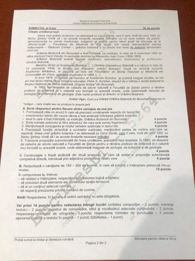 La subiectul al II-lea, elevii au primit un text scris de Andrei Vișan, numit ,,Cum s-a înființat Grădina Botanică din București”, pe baza căruia au avut de rezolvat mai multe cerințe. De asemenea, au avut de realizat un eseu despre o întâmplare la muzeu.