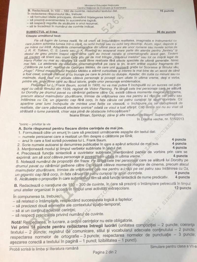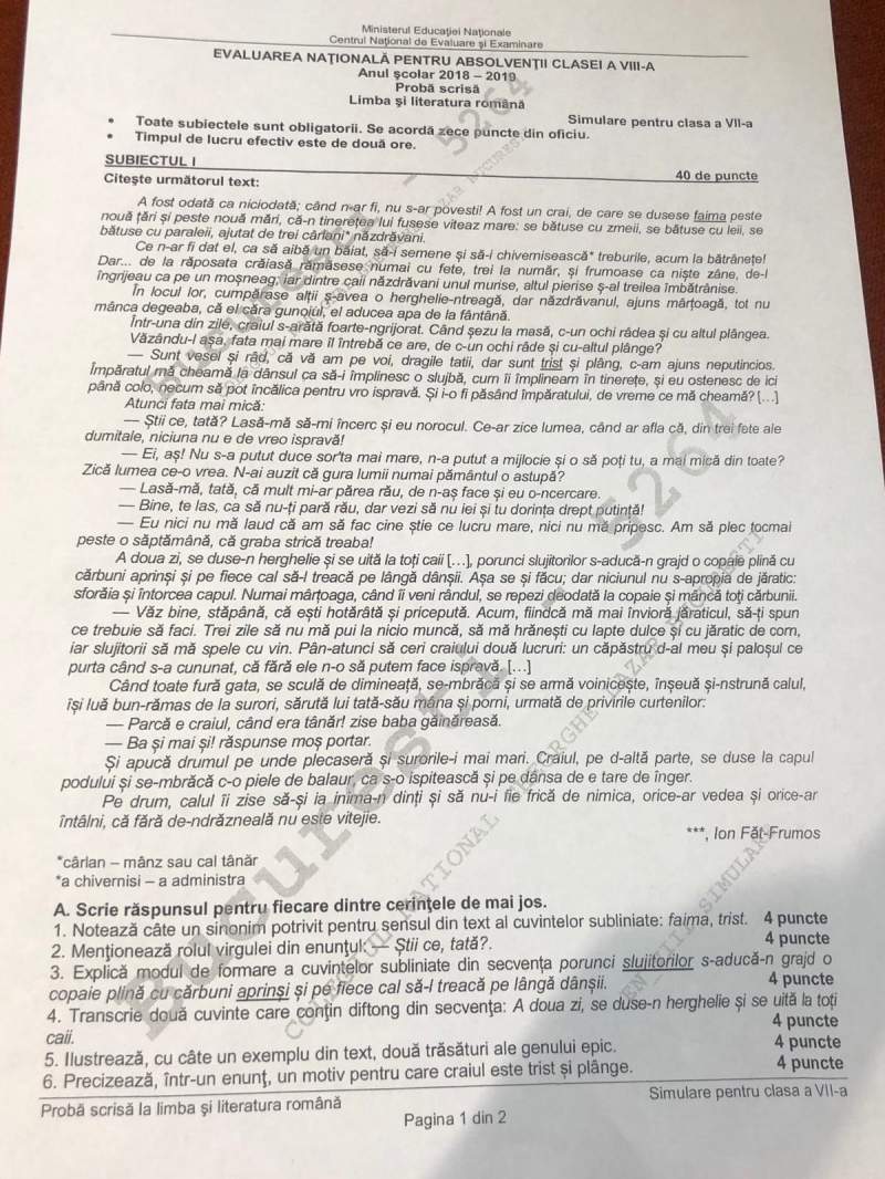 La simularea de la clasa a VII-a, elevii au avut de realizat un rezumat dintr-un basm popular. La subiectul al II-lea, aceștia au avut de realizat o compunere despre o activitate extrașcolară.