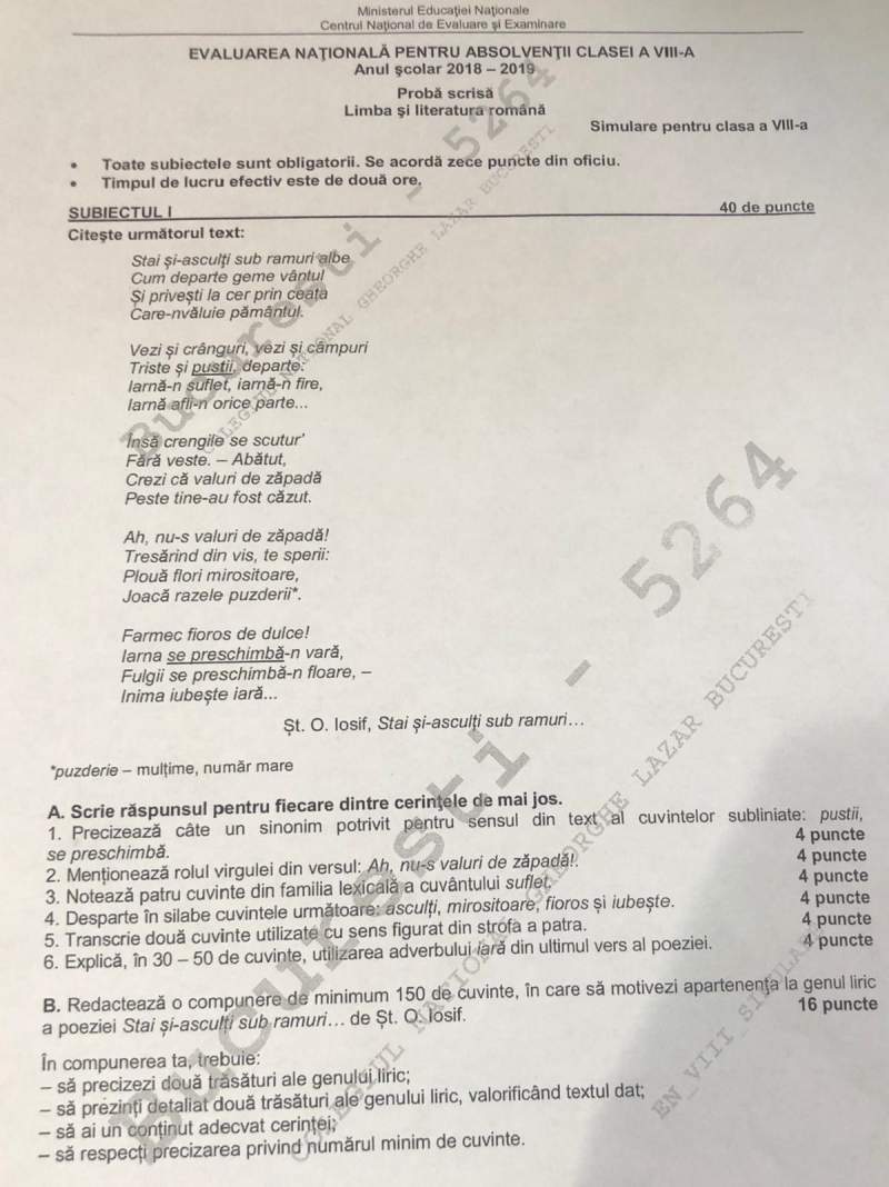 La subiectul I elevii de clasa a VIII-a au avut mai multe cerințe pe baza poeziei ,,Stai și-asculți sub ramuri…” de Ștefan Octavian Iosif.