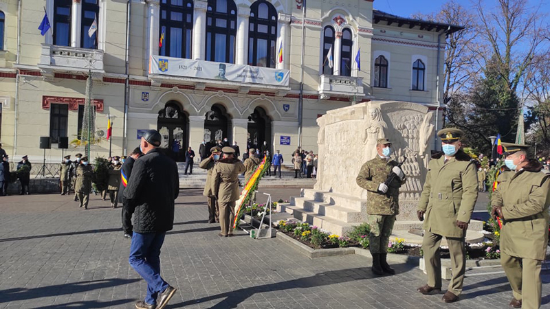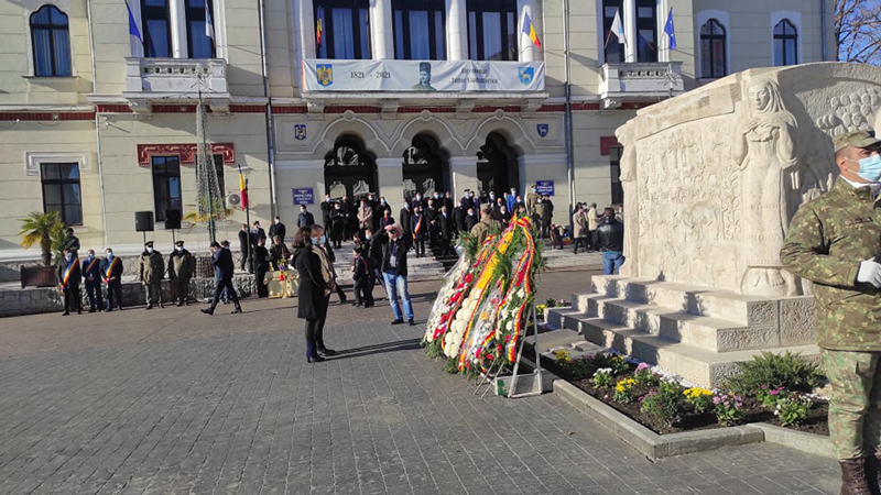 de flori la monumentul Ecaterinei Teodoroiu din centrul Pieței Prefecturii.