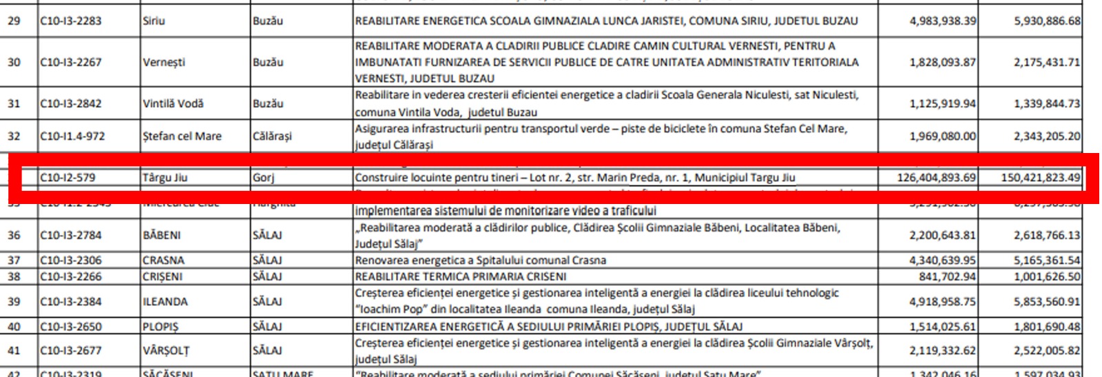 Pentru Fondul Local, au fost aprobate 42 de noi proiecte, în valoare totală de 255.227.470 lei, depuse de 35 de autorități. Cei mai mulți bani au fost obținuți de Primăria Municipiului Târgu-Jiu, pentru construirea de locuințe pentru tineri.