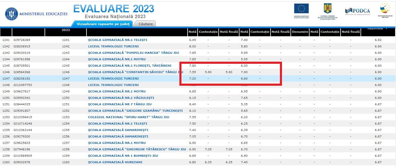 O diferență mare între nota inițială și cea finală se observă și la un candidat de la Colegiul Național „Spiru Haret” din Târgu Jiu, a cărui lucrare la Limba română avea nota 7.65, iar după recorectare a primit 9,30. La fel și în cazul unui absolvent al Școlii Gimnaziale „Gheorghe Tătărescu” din Târgu Jiu. De la 7.20 i-a fost mărită nota la 8.70!